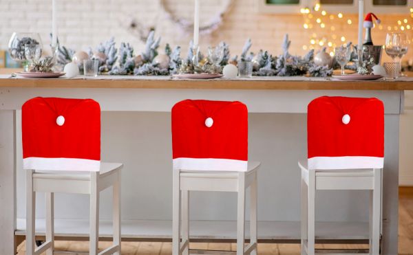 Te świąteczne pokrowce na oparcia krzeseł, o zachwycającym designie przypominającym czapki Świętego Mikołaja, prezentują żywy czerwony odcień podkreślony białym pluszowym pomponem na szczycie każdego pokrowca. Ten uroczy dodatek nadaje jadalni uroczego i świątecznego charakteru – to naprawdę ujmująca i uduchowiona ozdoba!