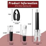 Ten zestaw 4 w 1 zawiera otwieracz z pompką powietrzną, obcinacz do folii, nalewak z aeratorem oraz korek próżniowy, zapewniając doskonałe wrażenia z degustacji wina.